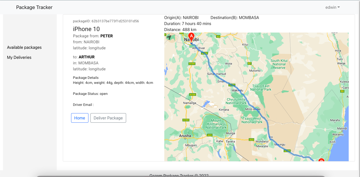 A client user on the web app can create a package, a driver user sees all available packages and chooses one to deliver to the intended destination, an admin user oversees the general functions of the web app. Built on a nodeJs backend server, MongoDB atlas database and react-redux frontend and app state manager.